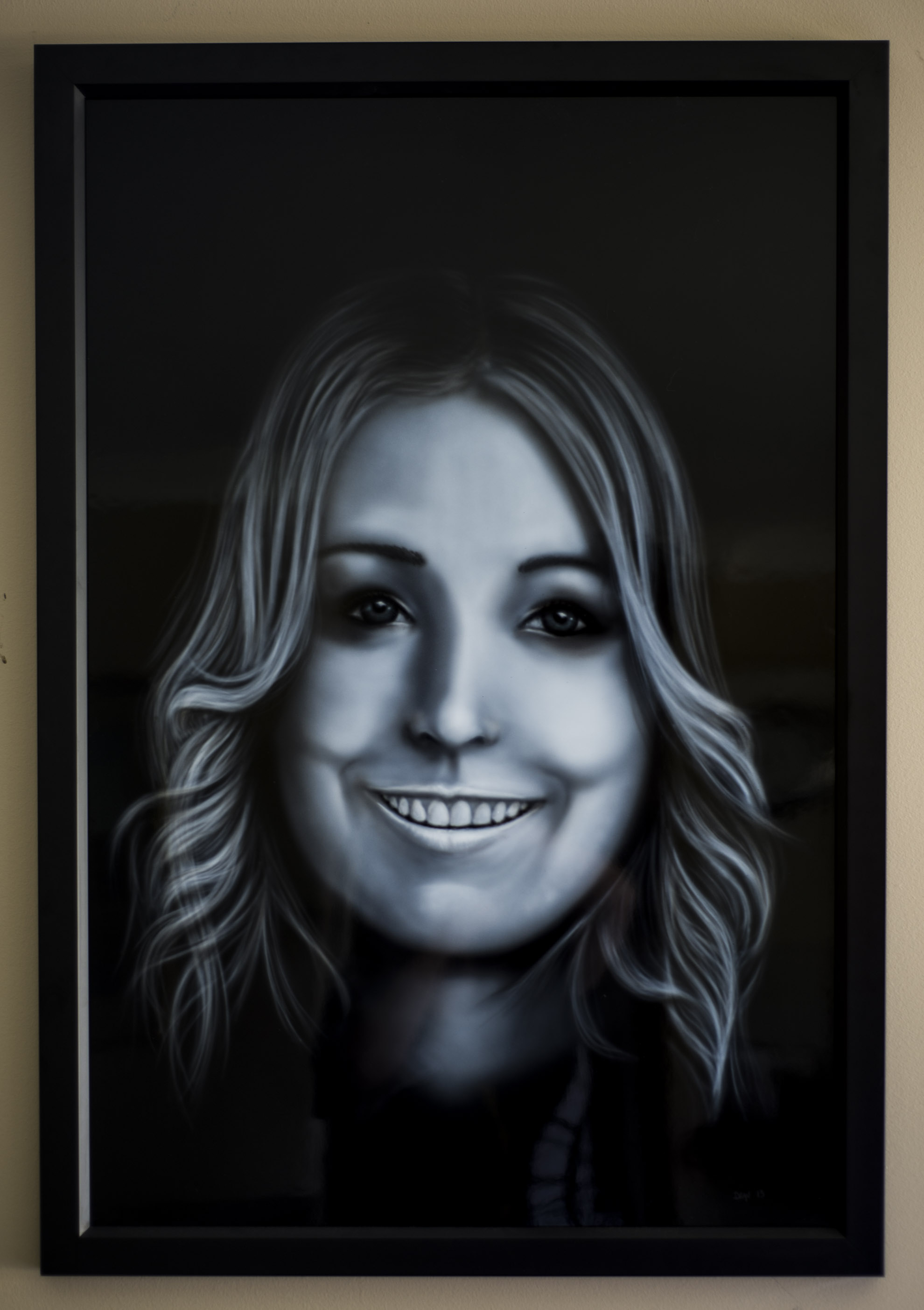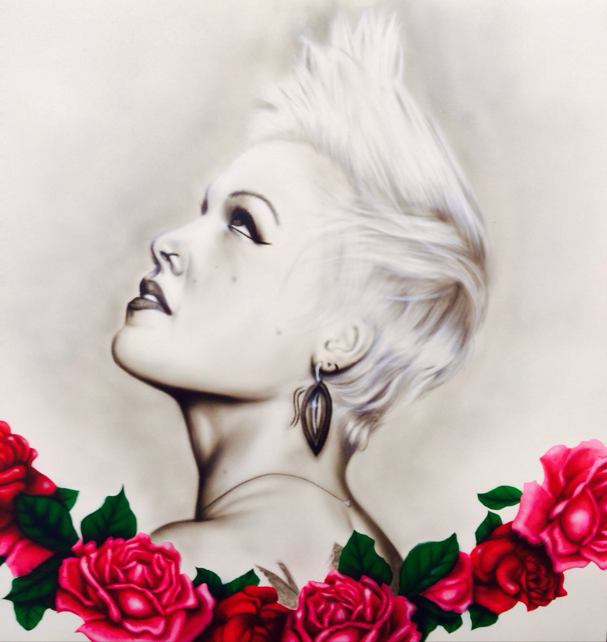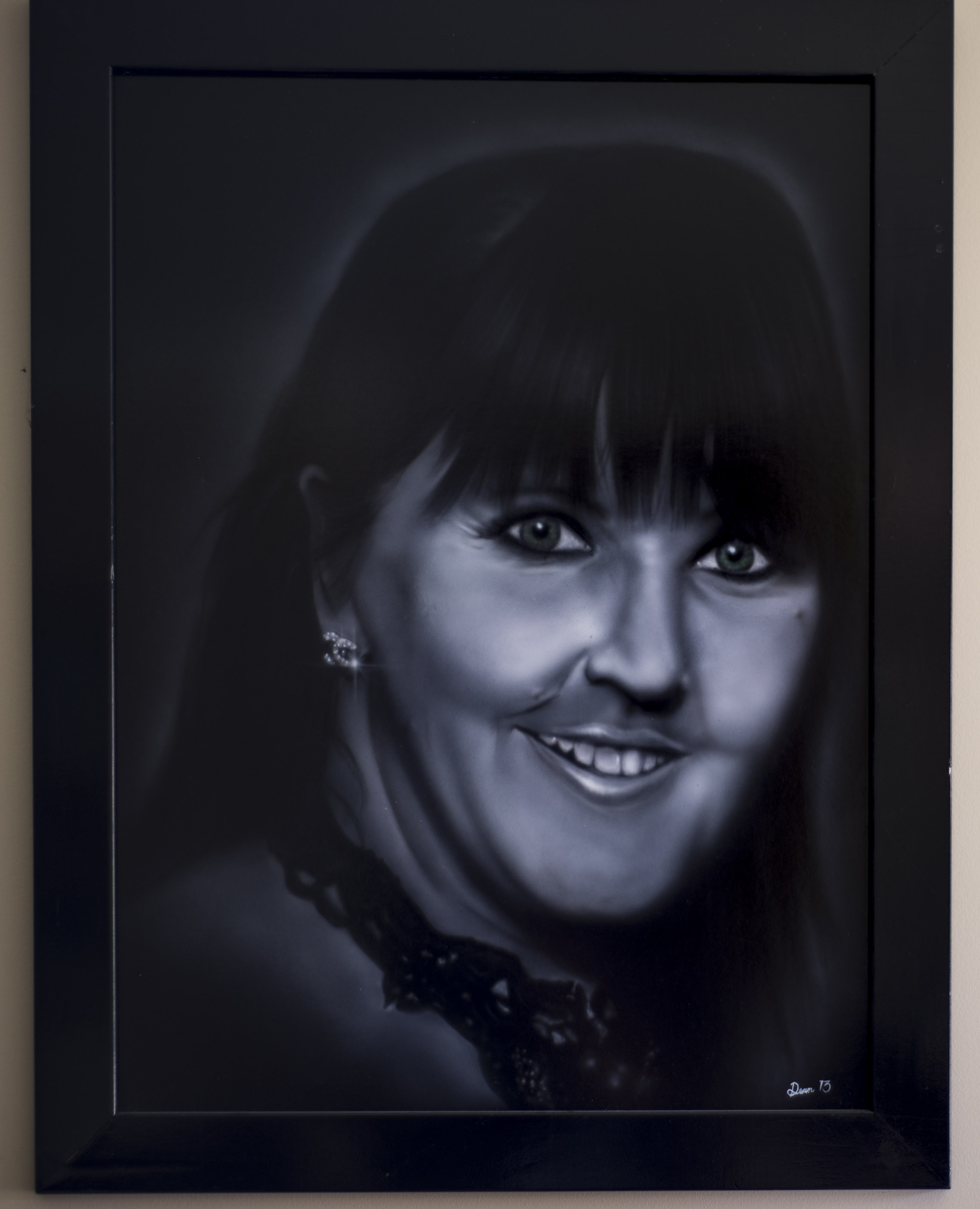 This painting was a commissioned piece. I love monochromatic airbrushing, it’s amazing how much depth and detail you can get with one colour. This portrait took me about 10 hours to complete.